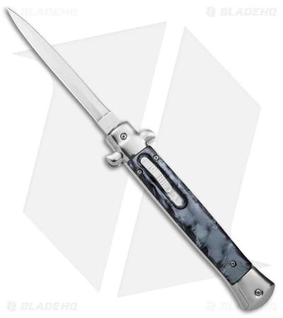 Pick up a unique and collectible design with the 11″ Italian Stiletto OTF automatic knife. This OTF model is built with a silver aluminum handle with silver bolsters, black marbled acrylic scales and a satin bayonet blade. It features classic Italian made craftsmanship and a dependable double-action OTF mechanism.
