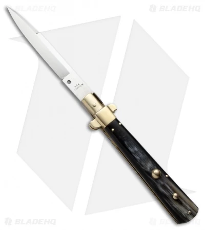 A.G.A Campolin presents this hand-crafted traditional stiletto direct from Italy. This beautiful knife features an AISI 420 stainless steel bayonet blade with a flared bolster lock on the spine. The push button release gives smooth and quick action, and there is a sliding safety button to guard against accidentally opening the blade.