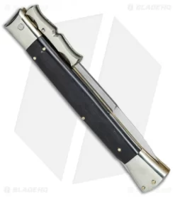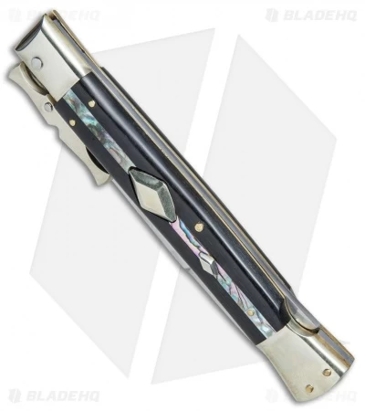 This Italian Stiletto from A.G.A. Campolin comes in the Bat Swinguard style with an abalone and ebony handle, nickel silver bolsters, and a bayonet blade. A.G.A. Campolin offers some of the finest traditional Italian Stiletto’s on the market, with a variety of collectible styles to choose from. This Bat Swinguard model has an abalone and ebony handle with nickel silver bolsters and buttons. Brass pins and liners add a classic touch to the design. The blade comes in a bayonet style with a plain edge and a polished finish. Add a piece of Italian history to your collection with the A.G.A. Campolin 13″ Swinguard Stiletto.