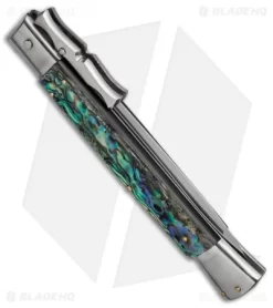 This Italian Stiletto from A.G.A. Campolin comes in the Bat Swinguard style with an abalone handle, dagger blade, and a shield shaped firing button. A.G.A. Campolin offers some of the finest traditional Italian Stiletto’s on the market, with a variety of collectible styles to choose from. This Bat Swinguard model has an abalone handle with nickel silver bolsters and buttons. Brass pins and liners add a classic touch to the design. The blade comes in a dagger style with a plain edge and a polished finish. Add a piece of Italian history to your collection with the A.G.A. Campolin 13″ Bat Swinguard Stiletto.