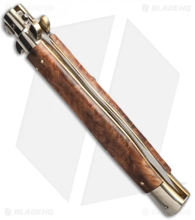 This is a gorgeous piece from AGA Campolin andis certain to become one of your collection favorites. The serpentine kriss blade has a high polish finish and is stamped with “AGA Campolin Italy – 2014” on the blade tang. The bolsters and buttons are polished nickel silver, while the liners and pins are polished brass, lending a rich tone to this elegant knife. The push button release tends to be more firm on these blades, but the action is smooth and the lock up is secure. There is a sliding safety to protect against the accidental opening of the knife. The burl wood handle scales give this knife a rich, earthy detail that is unique among these knives. To close the blade, pry back the Frosolone pick-lock at the base of the blade spine. Includes a soft leather storage pouch.