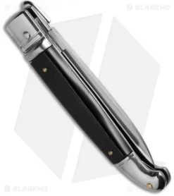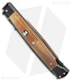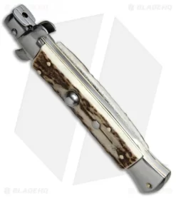 An impressive interpretation of the classic swinguard from AGA Campoloin. This knife measures 13 inches when opened and has a stylized swinguard. It features a polished stainless steel dagger blade, brass firing button, and a brass sliding safety. The rich stag handles are offset with brass pins, liners, and bolsters. The blade has fast, smooth action in spite of its size. The unique swinguard design gives the knife an almost medieval look. This is a must have for any serious Italian knife collector.