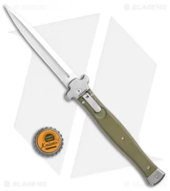 This Zero+ model features an OD green G-10 handle and a satin finished dagger blade.