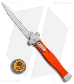 This Zero model features an orange G-10 handle and a stonewashed dagger blade.