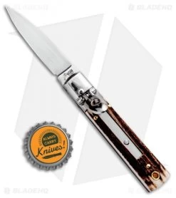 This 6″ Italian Stiletto from AKC comes in the Lever Lock style with a stag handle and a flat grind blade. AKC specializes in collectible Italian stilettos made with traditional knife-making techniques. Brass pins add a classic finishing touch to the design. Add classic Italian style to your collection with the AKC 6″ Lever Lock stiletto.