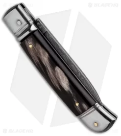 This 8″ Italian Stiletto from AKC comes in the Lever Lock Shot Puller style with a dark horn handle and a damascus blade. AKC specializes in collectible Italian stilettos made with traditional knife-making techniques. This 8″ Lever Lock model has a dark horn handle with a sturdy stainless steel liner. Brass pins and nickel silver bolsters add a classic finishing touch to the design. Add classic Italian style to your collection with the AKC 8″ Lever Lock stiletto.