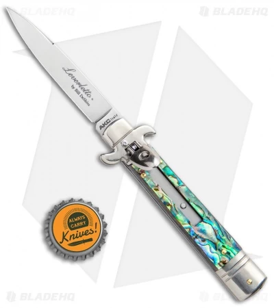 This 7.75″ Italian Stiletto from AKC comes in the Leverletto style with an abalone handle and a flat ground blade. AKC specializes in collectible Italian stilettos made with traditional knife-making techniques. The blade comes in a flat-ground style with a plain edge and a satin finish. Add classic Italian style to your collection with the AKC 7.75″ Leverletto stiletto.