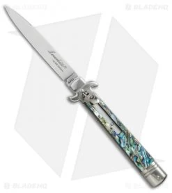 This 9″ Italian Stiletto from AKC comes in the leverletto style with an abalone handle and a bayonet blade. AKC specializes in collectible Italian stilettos made with traditional knife-making techniques. This 9″ Leverletto model has an abalone handle with a sturdy stainless steel liner. Brass pins add a classic finishing touch to the design. The blade comes in a drop point style with a plain edge and a satin finish. Add classic Italian style to your collection with the AKC 9″ Leverletto stiletto.