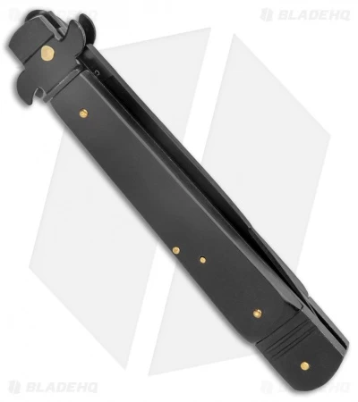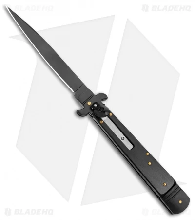 This 9″ Italian Stiletto from AKC comes in the Leverletto style with a black aluminum handle and a flat grind blade in a black finish. AKC specializes in collectible Italian stilettos made with traditional knife-making techniques. This 9″ Leverletto model has an aluminum handle with a stainless steel bolster. Satin finished pins add a classic finishing touch to the design. The blade comes in a drop point style with a plain edge and a black finish. Add classic Italian style to your collection with the AKC 9″ Leverletto stiletto.