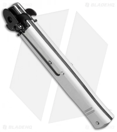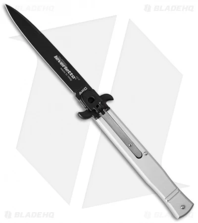 This 9″ Italian Stiletto from AKC comes in the Leverletto style with a silver aluminum handle and a flat grind blade with a black finish. AKC specializes in collectible Italian stilettos made with traditional knife-making techniques. This 9″ Leverletto model has an aluminum handle with a stainless steel bolster. Satin finished pins add a classic finishing touch to the design. The blade comes in a drop point style with a plain edge and a black finish. Add classic Italian style to your collection with the AKC 9″ Leverletto stiletto.