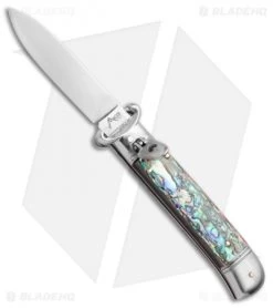 This 8″ Italian Stiletto from AKC comes in the Lever Lock Shot Puller style with an abalone handle and a flat grind blade. AKC specializes in collectible Italian stilettos made with traditional knife-making techniques. This 8″ Lever Lock model has a cocobolo handle with a sturdy stainless steel liner. Brass pins and nickel silver liners add a classic finishing touch to the design. The blade comes in a dagger style with a plain edge and a polished finish. Add classic Italian style to your collection with the AKC 8″ Lever Lock stiletto.
