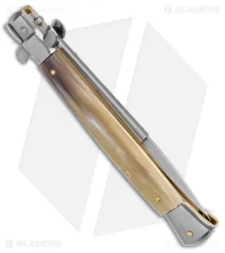 This knife is sure to take center stage in your collection. Using a combination of traditional elements, Frank Beltrame creates a work of art just for you. The polished dagger blade adds style and elegance. The swinguard is a clever piece of engineering that serves a useful purpose as well. The polished nickel silver bolsters and buttons stand out nicely from the dark, rich, Brazilian horn handle scales. The push button action is fast and the lock up is secure. The sliding safety on the front of the handle protects against the accidental release of the blade. Brass pins and liners also lend to the traditional look of this beautiful design.