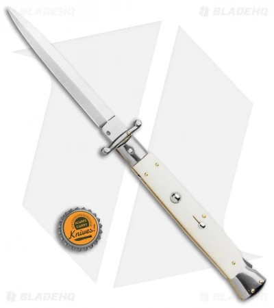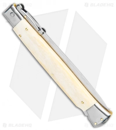 Add a unique and elegant Italian stiletto knife to your collection. The nickel silver guard, bolsters, and button show nicely against the ivory look of the camel bone scales, as do the brass pins and liners. This piece features a polished dagger blade. The firing is smooth and the blade has a quick release and solid lock up. It has a sliding safety that protects against accidental firing.
