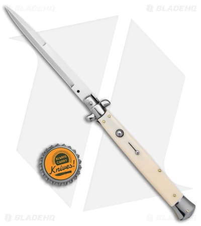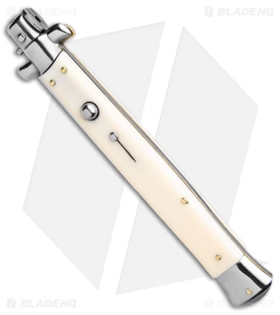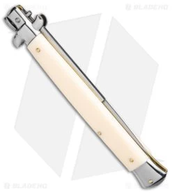 This Frank B. Italian stiletto has a handle with sliding safety. The blade fires at the push of a button. Brass pins and liners add a classic touch to the design. This is a beautiful collector’s piece. Frank B creates some of the finest authentic Italian stilettos available on the market today. The blade is lightly stamped “FRANK B ITALY.” Add the premier Italian knife-maker to your collection today with an authentic Italian stiletto from Frank B.