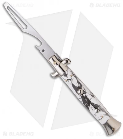 This 8.5″ Italian Stiletto from Frank B. features classic stiletto style with a white marble handle and a cleaver bottle opener blade. Frank B creates some of the finest authentic Italian stilettos available on the market today. Brass pins add a classic touch to the design. The bottle opener is made from stainless steel with a satin finish. Add the premier Italian knife-maker to your collection today with an authentic Italian stiletto from Frank B.
