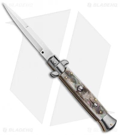 This 9″ Italian Stiletto from Frank B Italy offers classic stiletto style with a black lip pearl handle and a satin finished bayonet blade. Frank B makes a variety of Italian stilettos featuring traditional designs at an affordable price. This 9″ model has an black lip pearl handle with nickel silver bolsters. Brass pins add a classic finishing touch to the piece. The bayonet blade has a plain edge and a satin finish. Experience the affordable Italian quality of these authentic stilettos from Frank B Italy.