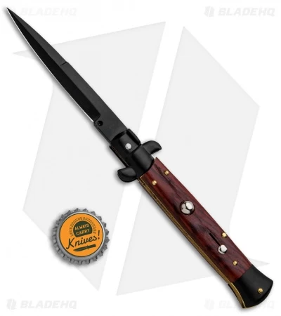 This 9″ Italian Stiletto from Frank B Italy offers classic stiletto style with a cocobolo handle and a black finished bayonet blade. Frank B makes a variety of Italian stilettos featuring traditional designs at an affordable price. This 9″ model has a cocobolo handle with black bolsters. Brass pins add a classic finishing touch to the piece. Experience the affordable Italian quality of these authentic stilettos from Frank B.
