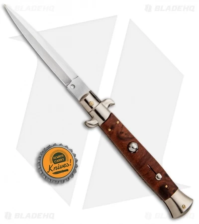 This 9″ Italian Stiletto from Frank B Italy offers classic stiletto style with a briar wood handle and a satin finished dagger blade. Frank B makes a variety of Italian stilettos featuring traditional designs at an affordable price. This 9″ model has an briar wood handle with nickel silver bolsters. Brass pins add a classic finishing touch to the piece. The dagger blade has a plain edge and a gold finish. Experience the affordable Italian quality of these authentic stilettos from Frank B Italy.