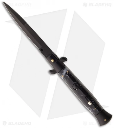 This 9″ Italian Stiletto from Frank B. features classic stiletto style with a black marble handle and a black finished blade. Frank B creates some of the finest authentic Italian stilettos available on the market today. This 9″ model has a black marble polymer handle with stainless steel liners and bolsters. Brass pins add a classic touch to the design. The blade comes in a bayonet style with a plain edge and a black finish. Add the premier Italian knife-maker to your collection today with an authentic Italian stiletto from Frank B.