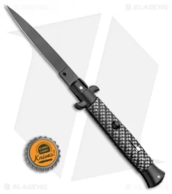 This 9″ Italian Stiletto from Frank B. features classic stiletto style with a simulated carbon fiber handle and a black finished blade. Frank B creates some of the finest authentic Italian stilettos available on the market today. This 9″ model has a simulated carbon fiber handle with stainless steel bolsters and liners. Brass pins add a classic touch to the design. Add the premier Italian knife-maker to your collection today with an authentic Italian stiletto from Frank B.