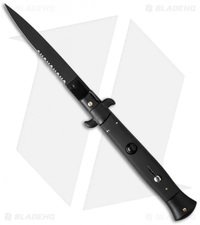 This 9″ Italian Stiletto from Frank B. features classic stiletto style with a Tactical Midnight black handle and a black finished blade with a partially serrated edge. Frank B creates some of the finest authentic Italian stilettos available on the market today. This 9″ Midnight Tactical model has a black polymer handle with stainless steel liners and bolsters. Brass pins add a classic touch to the design. The blade has a flat grind with a partially serrated edge and a black finish. Add the premier Italian knife-maker to your collection today with an authentic Italian stiletto from Frank B.