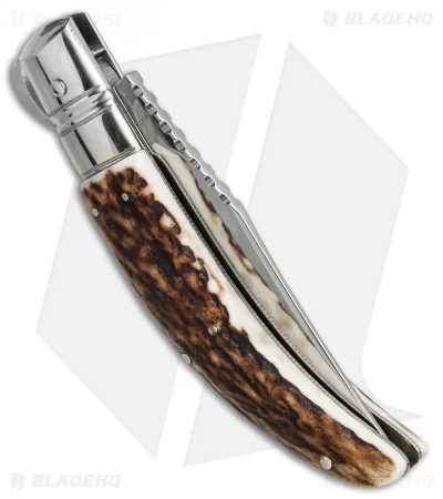 This 9″ Italian Stiletto from Lepre comes in the Sicilian Picklock style with a stag horn handle and a mirror polished clip point blade. Lepre creates beautiful automatic knives with the handcrafted details collectors are looking for. This 9″ model has a horn handle with nickel silver bolsters, pins, and buttons. Brass liners add a classic finishing touch to the design. The clip point blade has a plain edge and a polished finish. Upgrade your collection with an automatic stiletto from Lepre Knives.