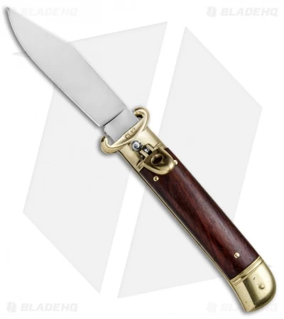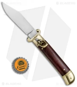 This 8″ Italian Stiletto from SKM comes in the Lever Lock Shot Puller style with a cocobolo wood handle, brass bolsters, and a flat grind blade. SKM specializes in collectible Italian stilettos made with traditional knife-making techniques. This 8″ Lever Lock model has a cocobolo handle with a sturdy stainless steel blade. Brass pins and liners add a classic finishing touch to the design. Add classic Italian style to your collection with the SKM 8″ Lever Lock stiletto.