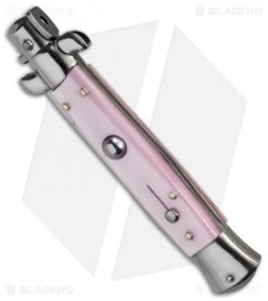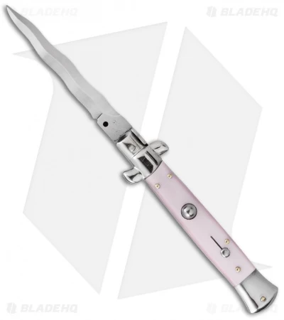 This 9″ Italian Stiletto from SKM Italy offers classic stiletto style with a pink pearlex handle and a satin finished kriss blade. SKM makes a variety of Italian stilettos featuring traditional designs at an affordable price. This 9″ model has a pearlex handle with stainless steel bolsters. Brass pins add a classic finishing touch to the piece. The kriss blade has a plain edge and a satin finish. Experience the affordable Italian quality of these authentic stilettos from SKM Italy.
