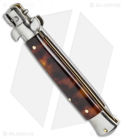 This 9″ Italian Stiletto from SKM Italy offers classic stiletto style with a tortoise acrylic handle and a satin finished blade. SKM makes a variety of Italian stilettos featuring traditional designs at an affordable price. This 9″ model has an acrylic handle with stainless steel bolsters. Brass pins and liners add a classic finishing touch to the piece. The blade has a flat grind with a plain edge and a satin finish. Experience the affordable Italian quality of these authentic stilettos from SKM Italy.