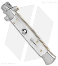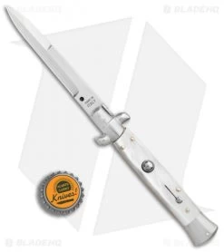 This 9″ Italian Stiletto from SKM Italy offers classic stiletto style with a white pearlex handle and a satin finished bayonet blade. SKM makes a variety of Italian stilettos featuring traditional designs at an affordable price. This 9″ model has a pearlex handle with stainless steel bolsters. Brass pins add a classic finishing touch to the piece. The bayonet blade has a plain edge and a satin finish. Experience the affordable Italian quality of these authentic stilettos from SKM Italy.