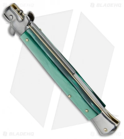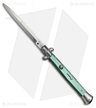 This 11″ Italian Stiletto from SKM Italy offers classic stiletto style with a green pearlex handle and a bayonet blade. SKM worked with famed knife-maker Armando Beltrame to bring you traditional stiletto designs at an affordable price. This 11″ model has a pearlex handle with stainless steel bolsters. Brass pins and liners add a classic finishing touch to the piece. The bayonet blade has a plain edge and a satin finish. Experience the affordable Italian quality of these authentic stilettos from SKM Italy.